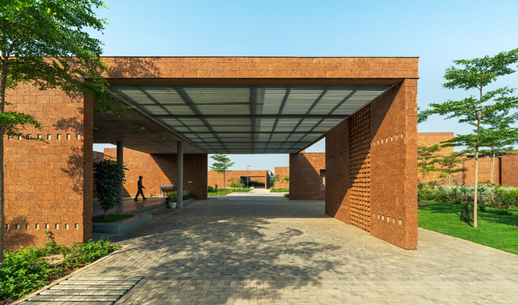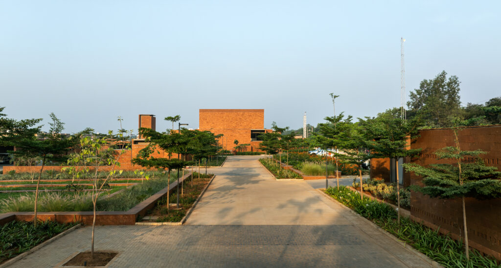 The 20 acre site in Bhuvaneshwar is located on a laterite bed. The site contained two existing pits from quarrying, and these form a natural water body during the rain. The design retained these pits, re-imagining them as rainwater harvesting ponds, and introduced an additional shallow water body.
