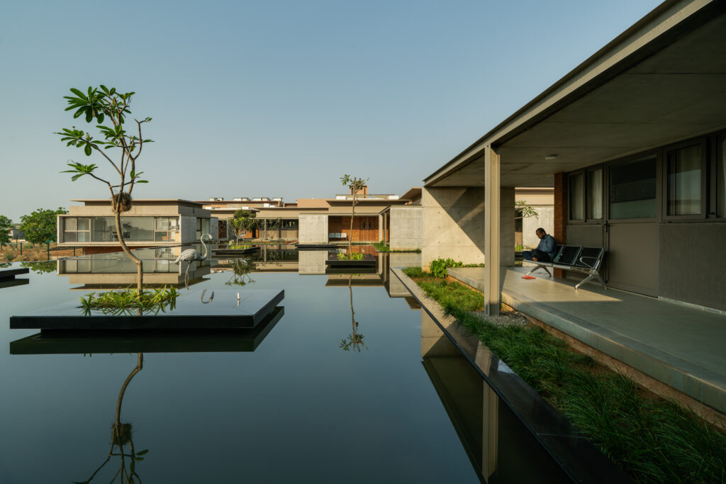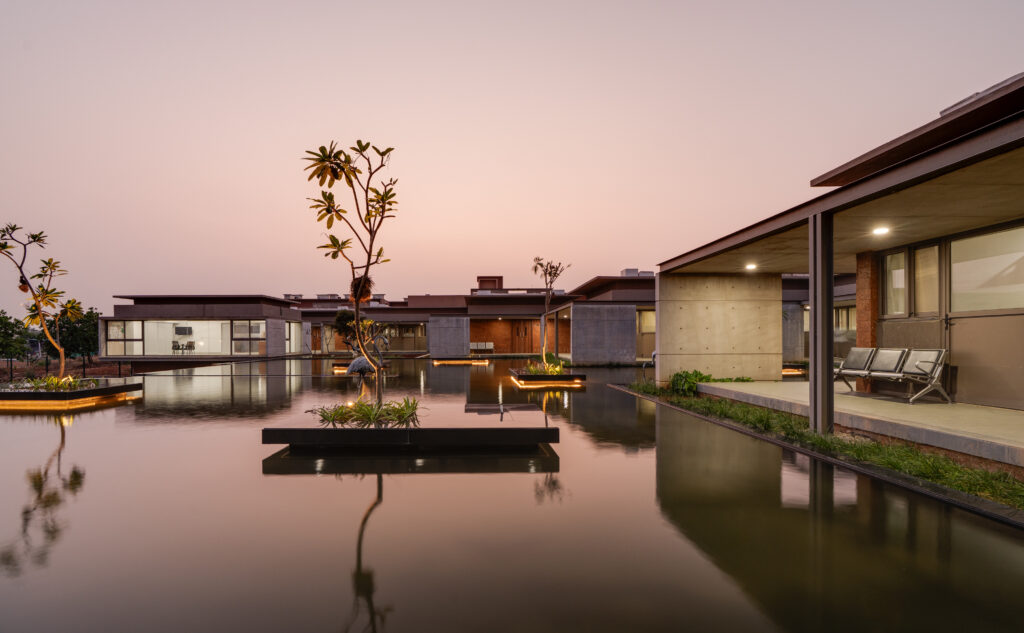 The wards were designed in an L shape to provide the nurses with best visibility from the central nursing station. Beds and chairs can be easily wheeled out to the verandahs, making them a spillout space to help residents come closer to nature. Initially, the plan was to keep the wards naturally ventilated. But with the hot and humid climate at Odisha, it was decided that patient comfort was of utmost importance, and the wards were air-conditioned. The common spaces were naturally cooled with the wind movement, as well as the artificial water body and natural pond.