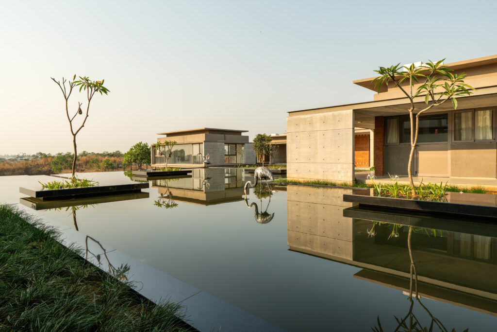 The materials were selected to blend in with nature while responding to the site geography and geology. As an ode to the site which was a laterite quarry, the cladding was done in laterite stone. Grey was extensively used with kota flooring, and cobbles on walls. The palette, profile, and location of buildings near the waterbody was also inspired in part by the temples of the region.