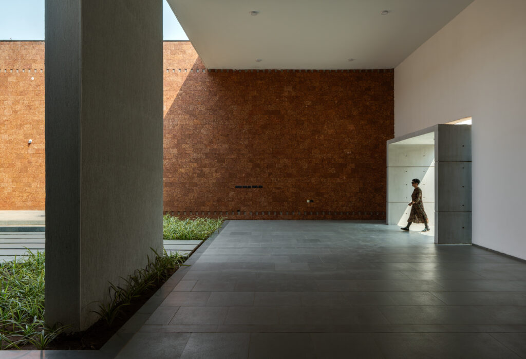 The auditorium is a semi-public zone, used by the staff but also rented out for external events. It has its own entry with a pre-function area, and the first encounter with the auditorium is through a series of blank walls. The main structure and surrounding plazas are revealed slowly. Intentional punctures create a play of light and element of surprise, with framed views of the outside. The auditorium and the spaces around are used by the staff for monthly homage to departed souls, for yoga and other recreational activities.
