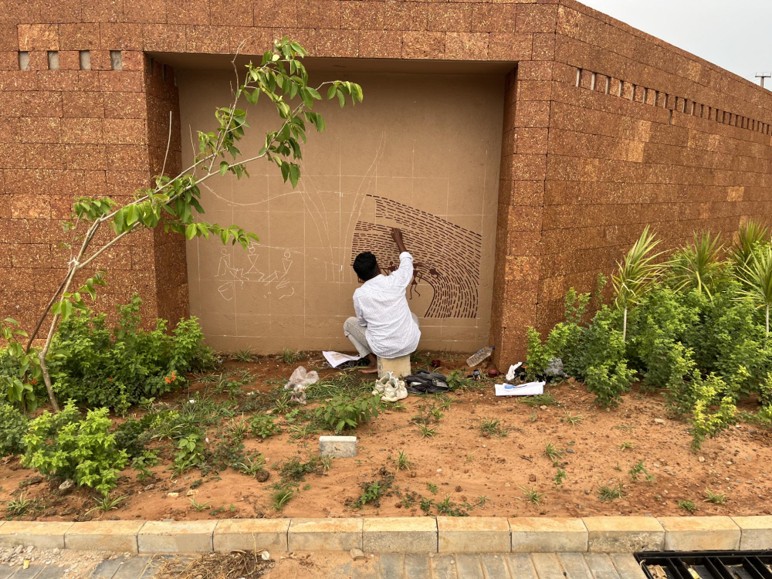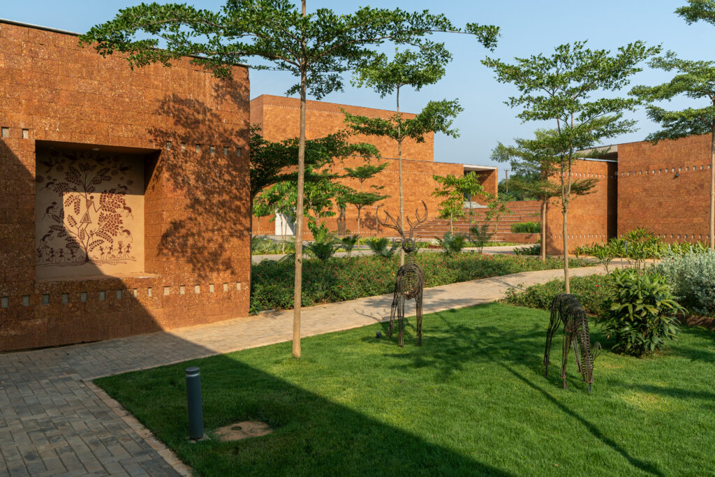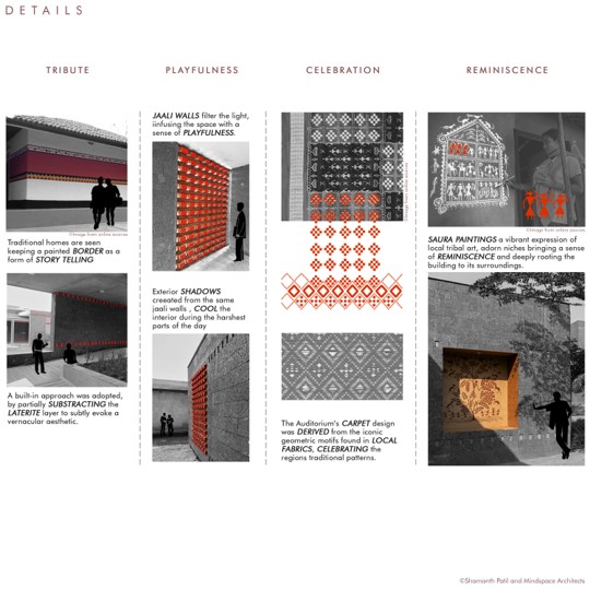 Odisha is a state rich in traditional art and craft, with several unique art forms like pattachitra, saura art, sambhalpuri weaves and dhokra art. We visited the village of Raghurajpur, a renown crafts village where every home is an artisan’s home, and the entire village was painted with traditional pattachitra artwork. These art forms were incorporated into the buildings in different ways: through the artwork inlay in recessed panels on the walls, in the horizontal band on the facade, and even in the geometrical motifs pattern of carpets in the auditorium.