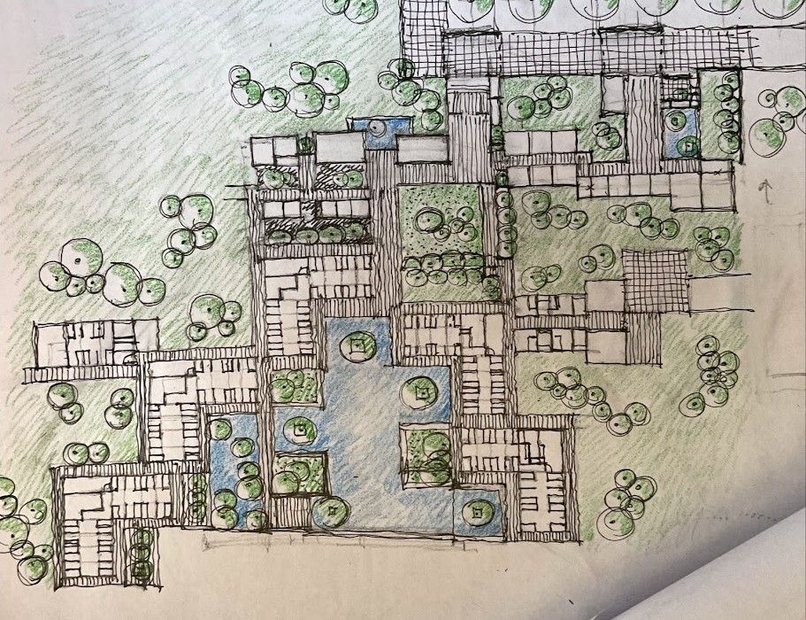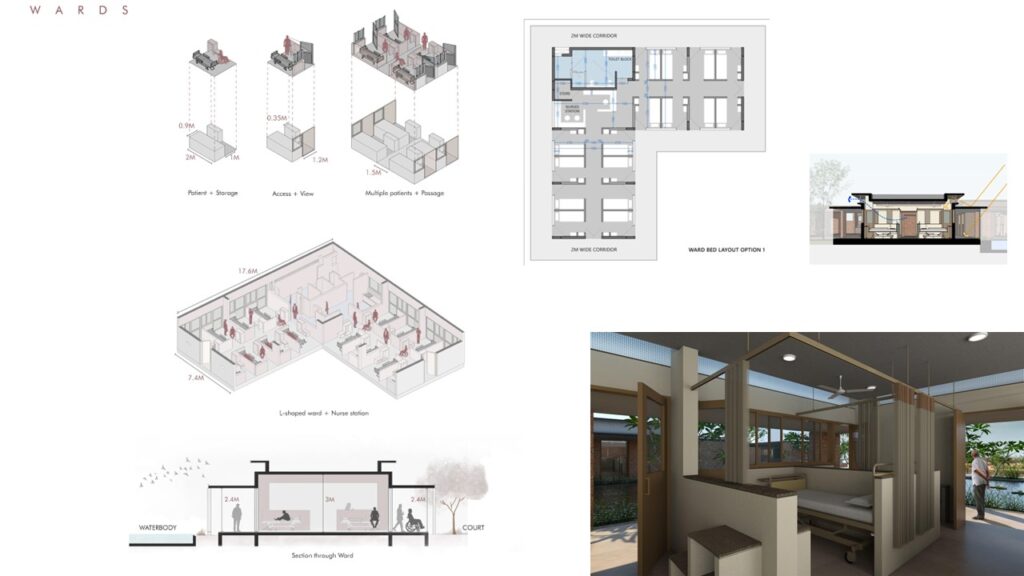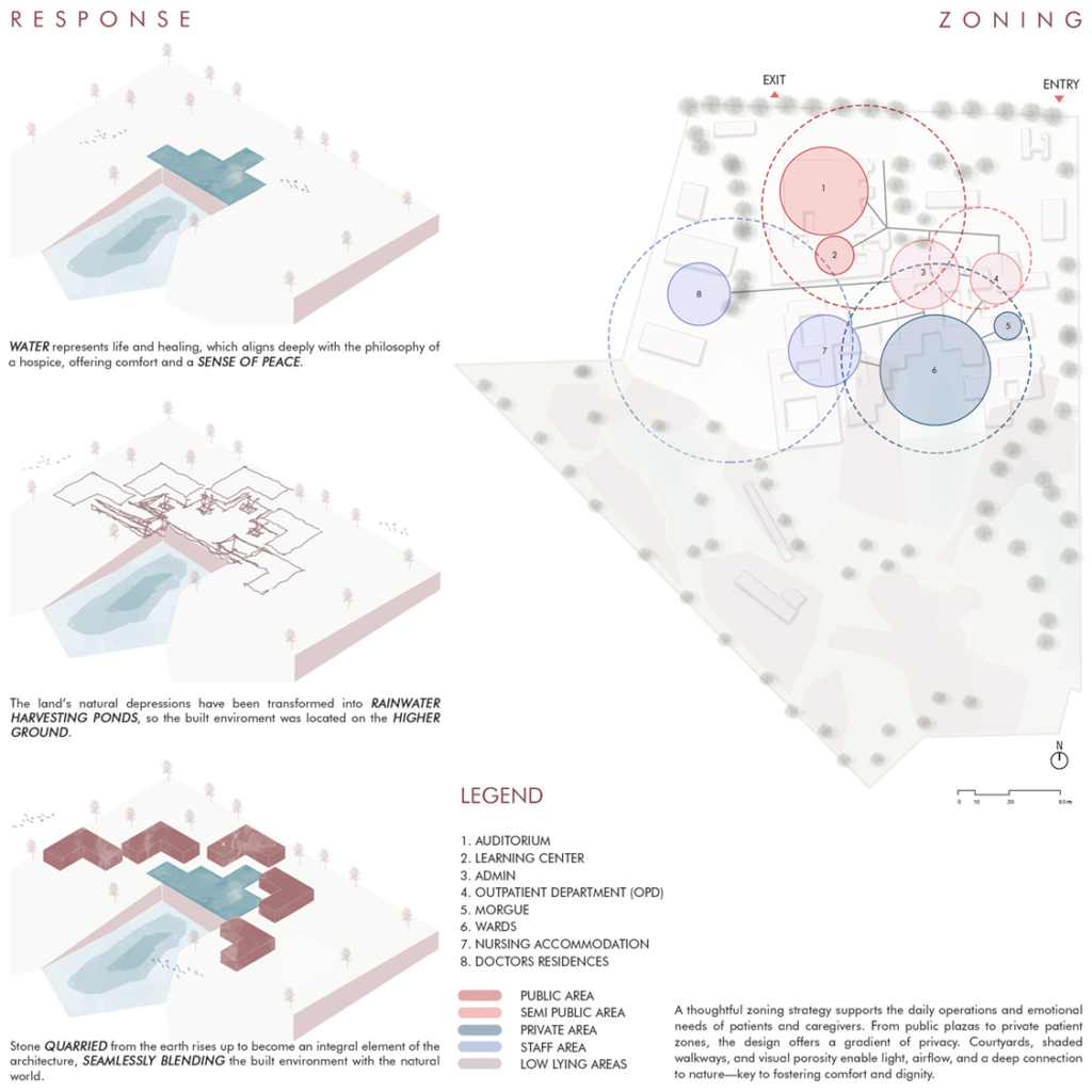The functional spaces such as the Outpatient Department, Administrative Block, In-patient Wards, Nurses’ Housing, Learning Center, Auditorium, and Staff Residences are dispersed according to function, privacy requirements, and topography.