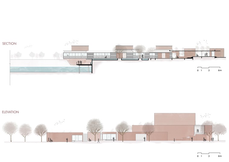 The building was placed along the edge of the quarry, spread around central landscaped plazas, to harness the views of the water and maximise access to greenery. This results in a meditative space with an interplay of built and unbuilt spaces. The built form follows the gradual gradient of the site, with gradual drops and ramps allowing barrier-free movement throughout the campus.